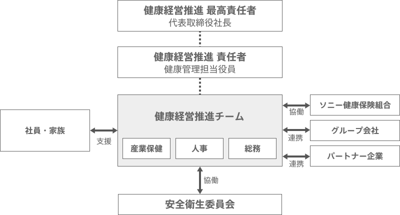 ソニーピープルソリューションズ株式会社では、健康経営最高責任者を代表取締役社長、責任者を健康管理担当役員とし、産業医、産業保健スタッフ、人事/総務部門等からなる健康経営推進チームが中心となり、安全衛生委員会やソニー健康保険組合、グループ会社、パートナー企業と連携し、健康経営を推進しています。