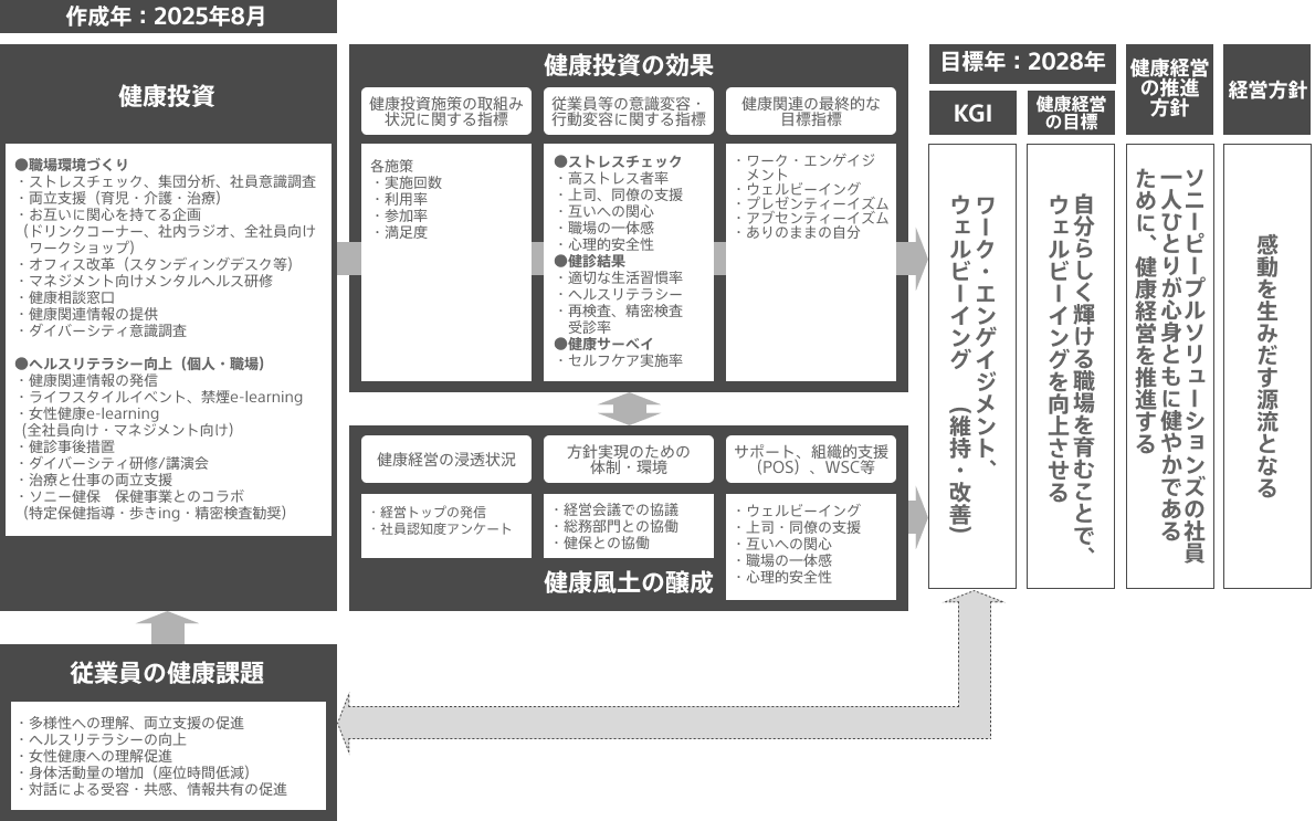 ソニーピープルソリューションズ株式会社では、社員一人ひとりが、その人らしくいきいきと働き、活躍できる環境を整えることを目指し、社員の健康課題に真摯に向き合い、具体的な取り組みと目標となる指標を体系的に整理した戦略マップを策定し、運用しています。